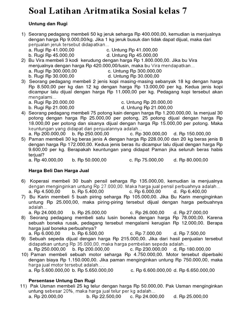 Savesave soal latihan aritmatika sosial kelas 7.docx for later. Generalisasi dari aritmatika dan pola yang ada di matematika 2. Penerapan hots pada aritmatika sosial kata aritmatika berasal dari bahasa yunani arithmetic yang memiliki arti seni berhitung dan juga dari kata 17 umi salamah, berlogika dengan matematika untuk kelas viii smp dan mts (solo: Harga pembelian satu lusin pensil rp36.000,00, sedangkan harga penjualannya rp4.000,00 per buah. Kumpulan soal matematika smp kelas 7 dirangkum oleh moch.